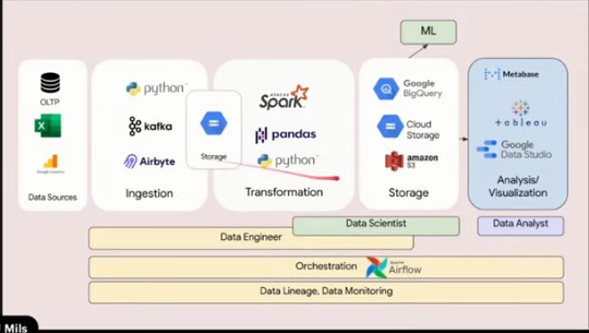 Ingestion ต้นทาง (Data Lake) => Transformation => Storage (Data Warehouse) <= Analysis (Analyst/ML/Engineer)